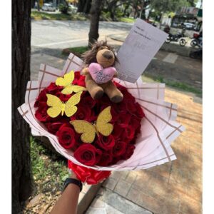 Buchon de rosas con mariposa y peluche mediano floristeria en cali