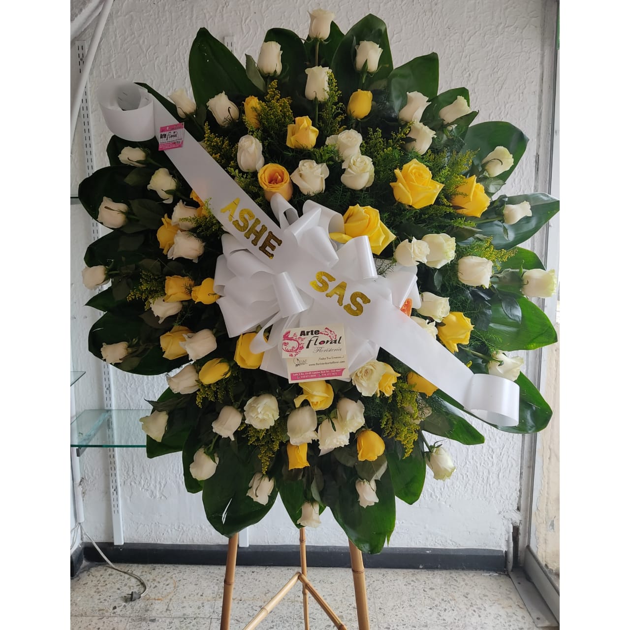 48 unidades de rosas blancas, amarillas, follaje, moño, cinta, base trípode de bambú , tarjeta.