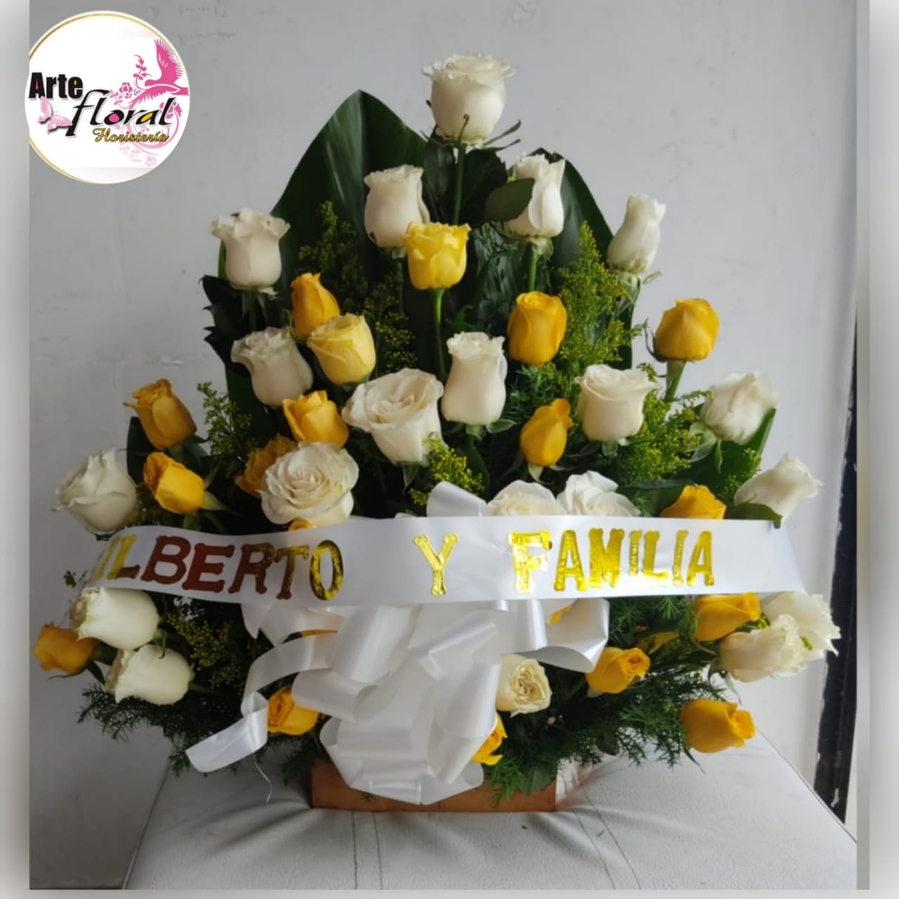 Rosas blancas, amarillas, moño , cinta , follaje y base de bambú.