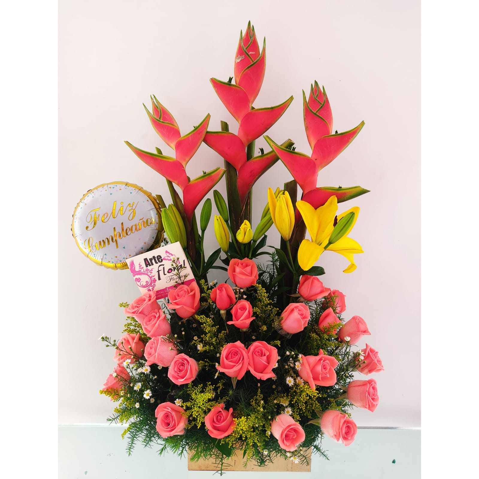 Arreglo triangulo rosas salmón, lirios, heliconias, globo y tarjeta