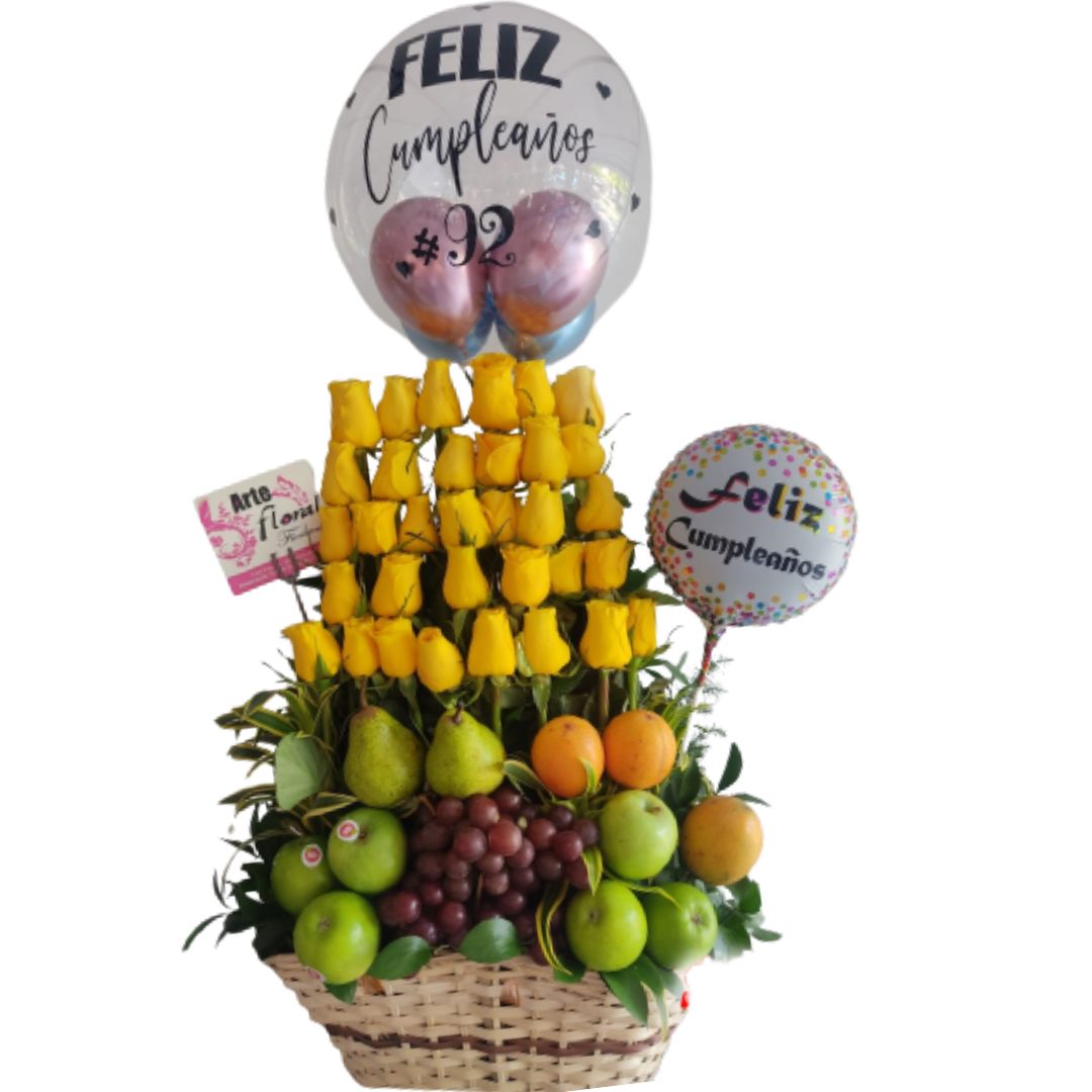 Canasta de frutas en rosas amarillas   y tarjeta impresa