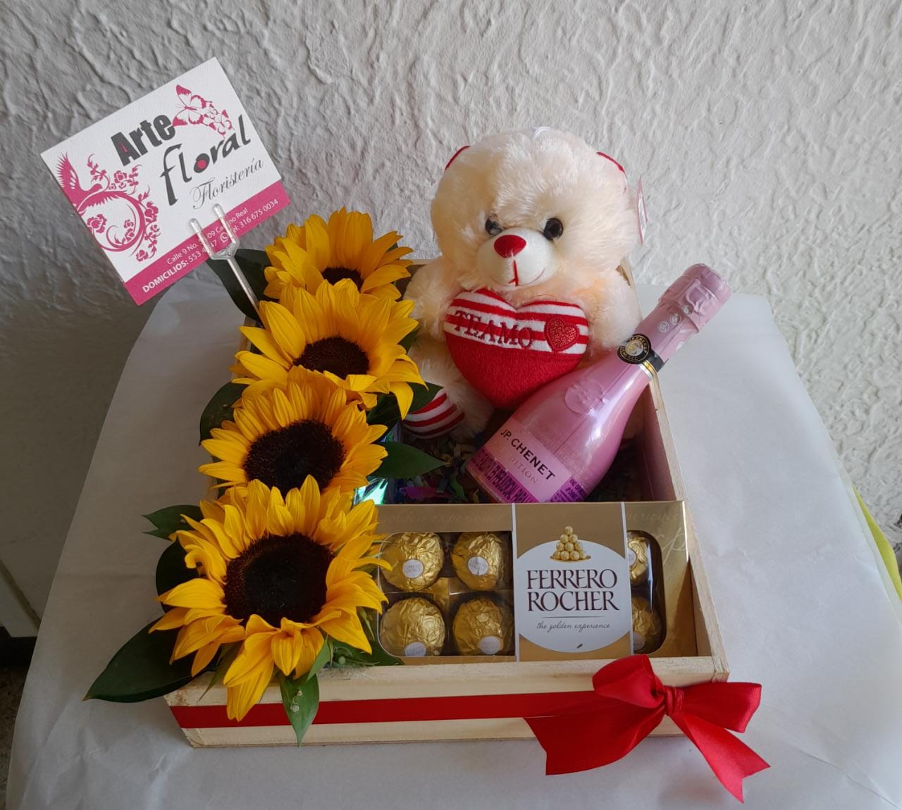 Girasoles,Champaña Jp ,  ferreros, peluche y Tarjeta
